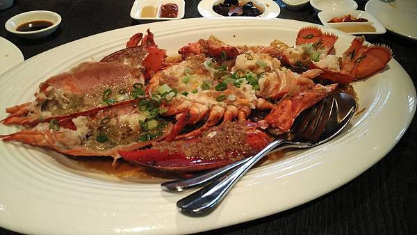 波士頓龍蝦上鋪有蒜頭與香蔥,下鋪有寬冬粉,醬汁鹹度適中,再加上龍蝦本身的新鮮香甜及有勁的蝦肉,整體非常好吃。